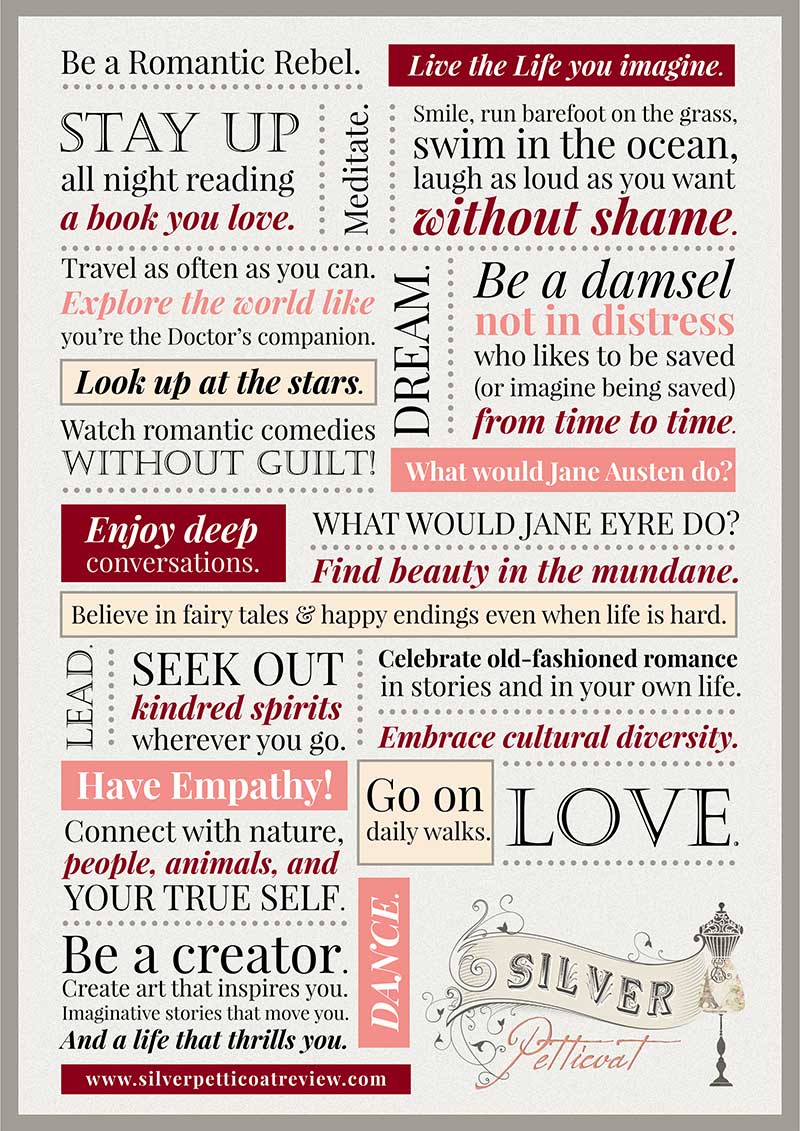 So, with that, today, we introduce our all-new Manifesto for The Silver Petticoat Review. Part of our mission (on top of promoting romance in entertainment) is to help inspire kindred spirits to live more imaginative, Romantic lives so together we can all create a more beautiful world.